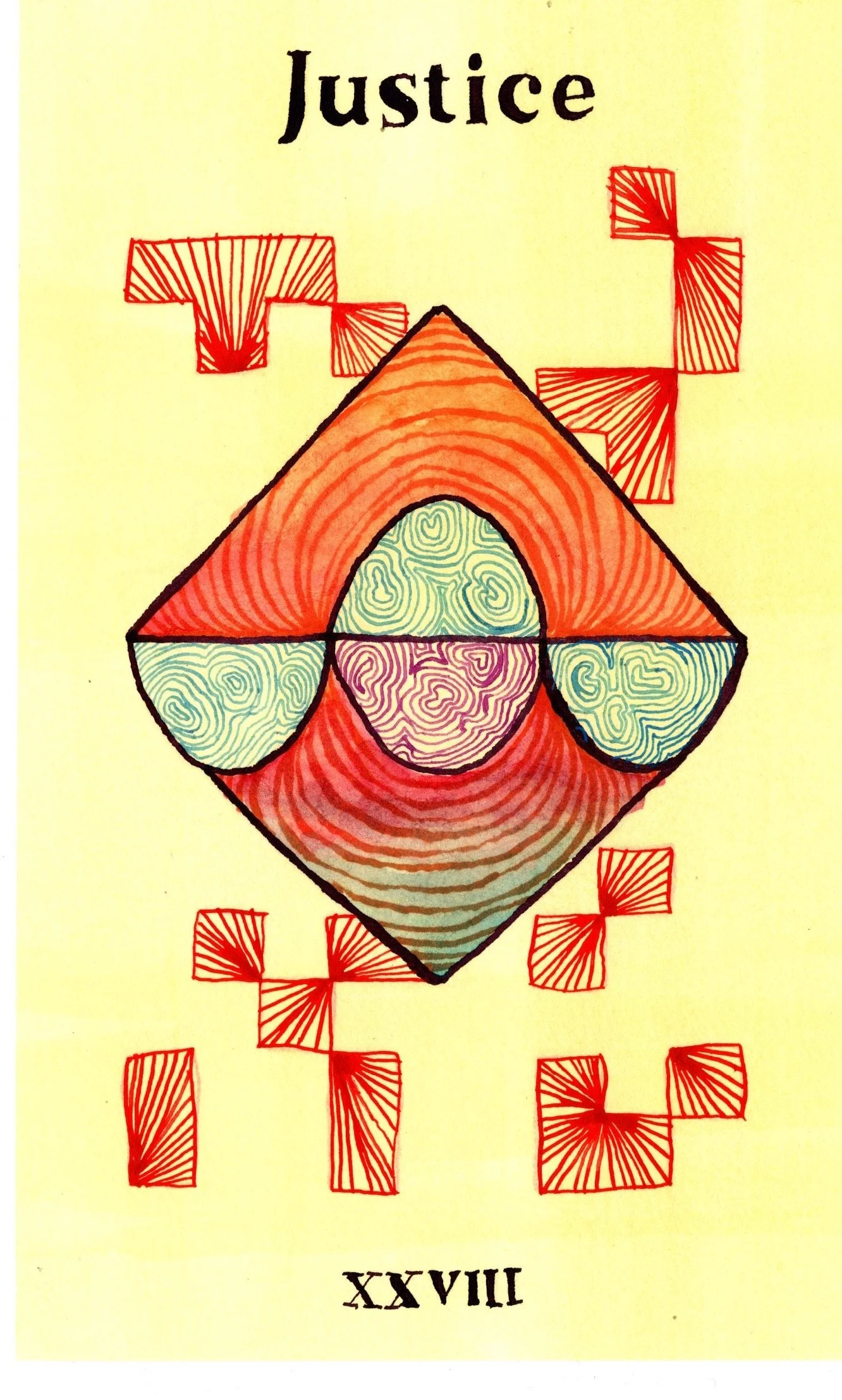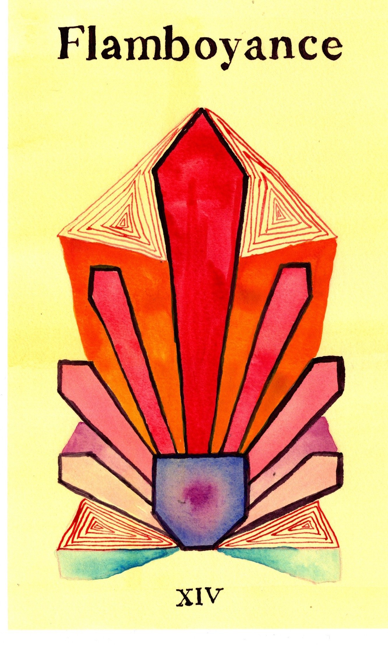His most ambitious project is one that never came to fruition – an oracle deck, complete with its own form of cartomantic language. The 37-card deck, hand illustrated with watercolors and ink, includes vague and esoteric concepts like “flamboyance”, “rage”, and “echos”, as well as references to more tangible things; “trees”, “coffin”, and “house”. Unlike the famous Rider-Waite tarot deck, illustrated by Pamela Colman Smith, Bordeaux’s oracle deck neither has an historic card game to base itself on nor a well known established meanings behind the various symbology implemented in each card's design. Instead, Bordeaux hand wrote his own guidebook along with how to use the cards for divination and other cartomancy practices.